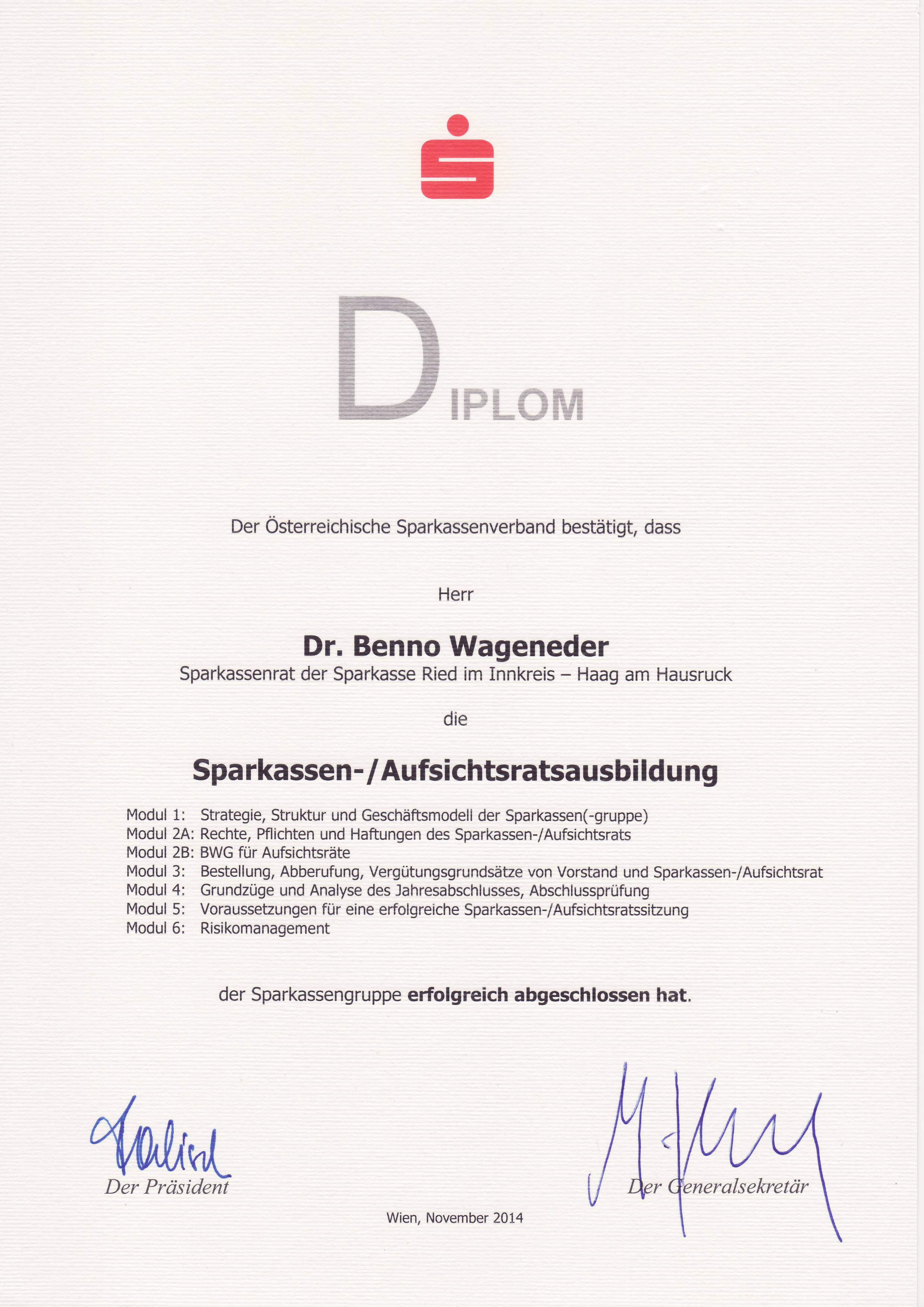 Seit 2010 ist Dr. Benno Wageneder auch im Aufsichtsrat der Sparkasse Ried-Haag. Das Diplom hat Dr. Benno Wageneder im November 2014 erhalten. Von 1991 bis 2009 war Dr. Benno Wageneder im Gemeinderat von Ried im Innkreis tätig und fungierte 10 Jahre als Obmann des Prüfungsausschusses der Stadtgemeinde.